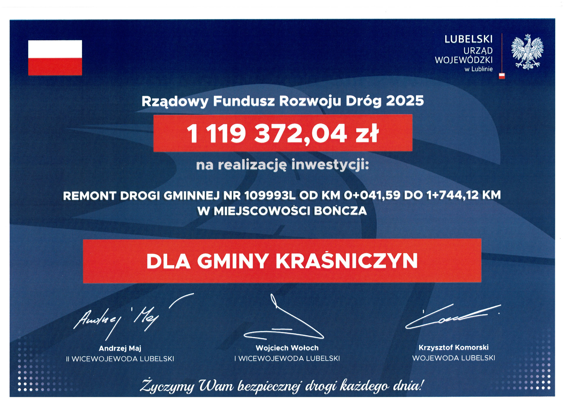 W dniu 17 września Wojewoda Lubelski Krzysztof Komorski podpisał umowę z Wójtem Gminy Kraśniczyn Janem Chorągiewiczem przy kontrasygnacie Skarbnika Andrzeja Gierszona na realizację kolejnej inwestycji drogowej w miejscowości Bończa. 🚧