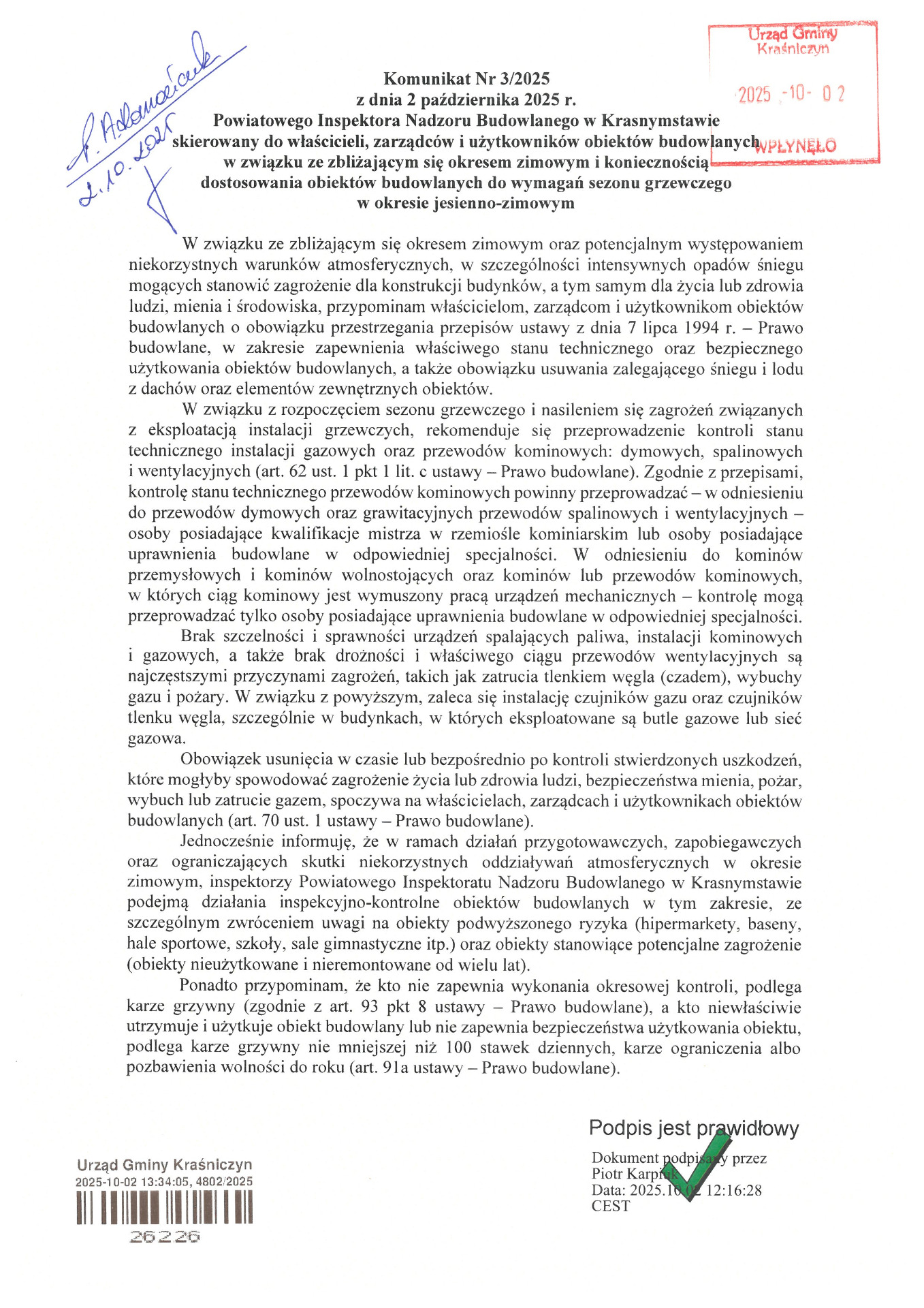 Komunikat Powiatowego Inspektora Nadzoru Budowlanego w Krasnymstawie