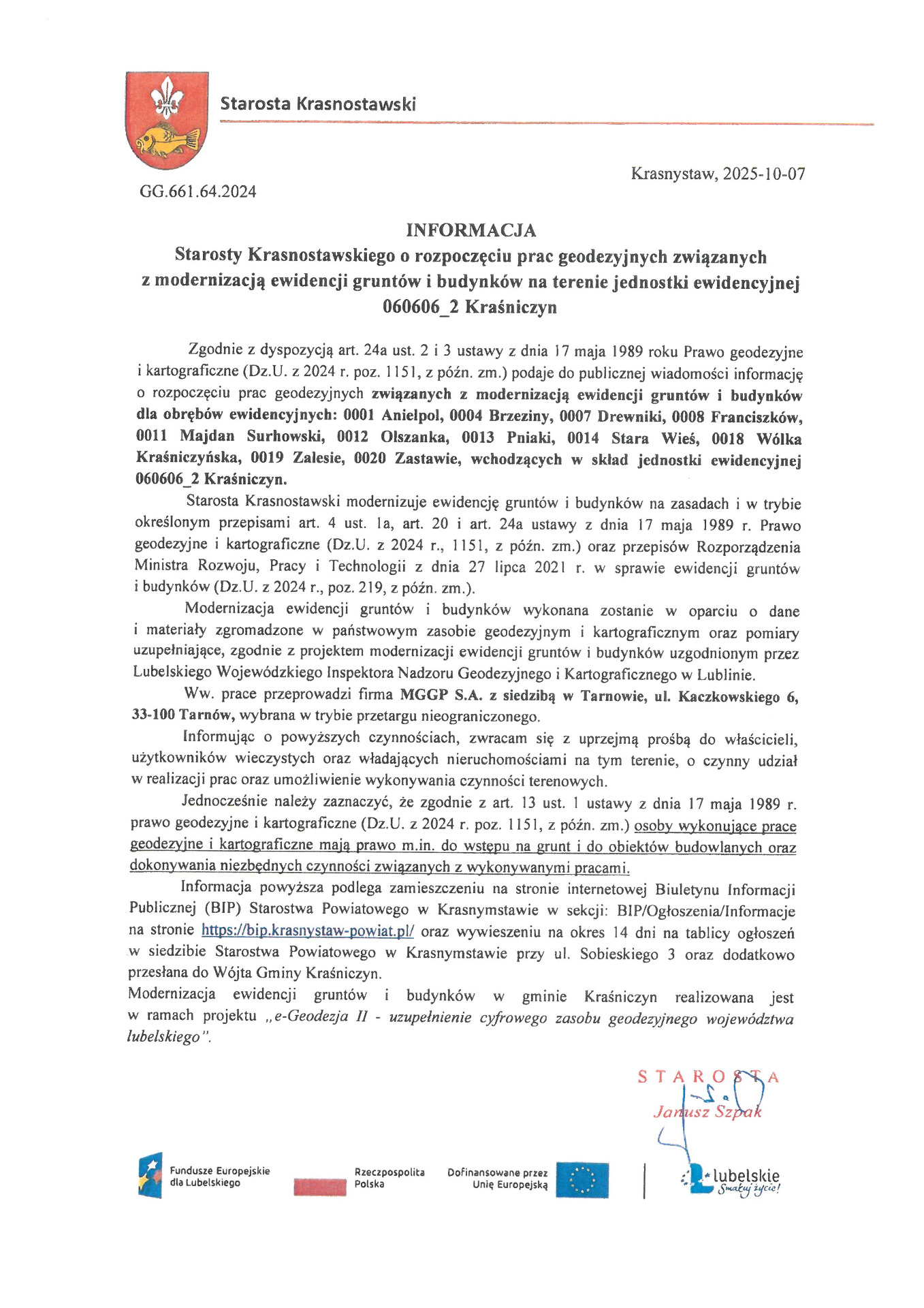 Informacja Starosty Krasnostawskiego o rozpoczęciu prac geodezyjnych związanych z modernizacją gruntów i budynków na terenie jednostki ewidencyjnej 060606_2 Kraśniczyn