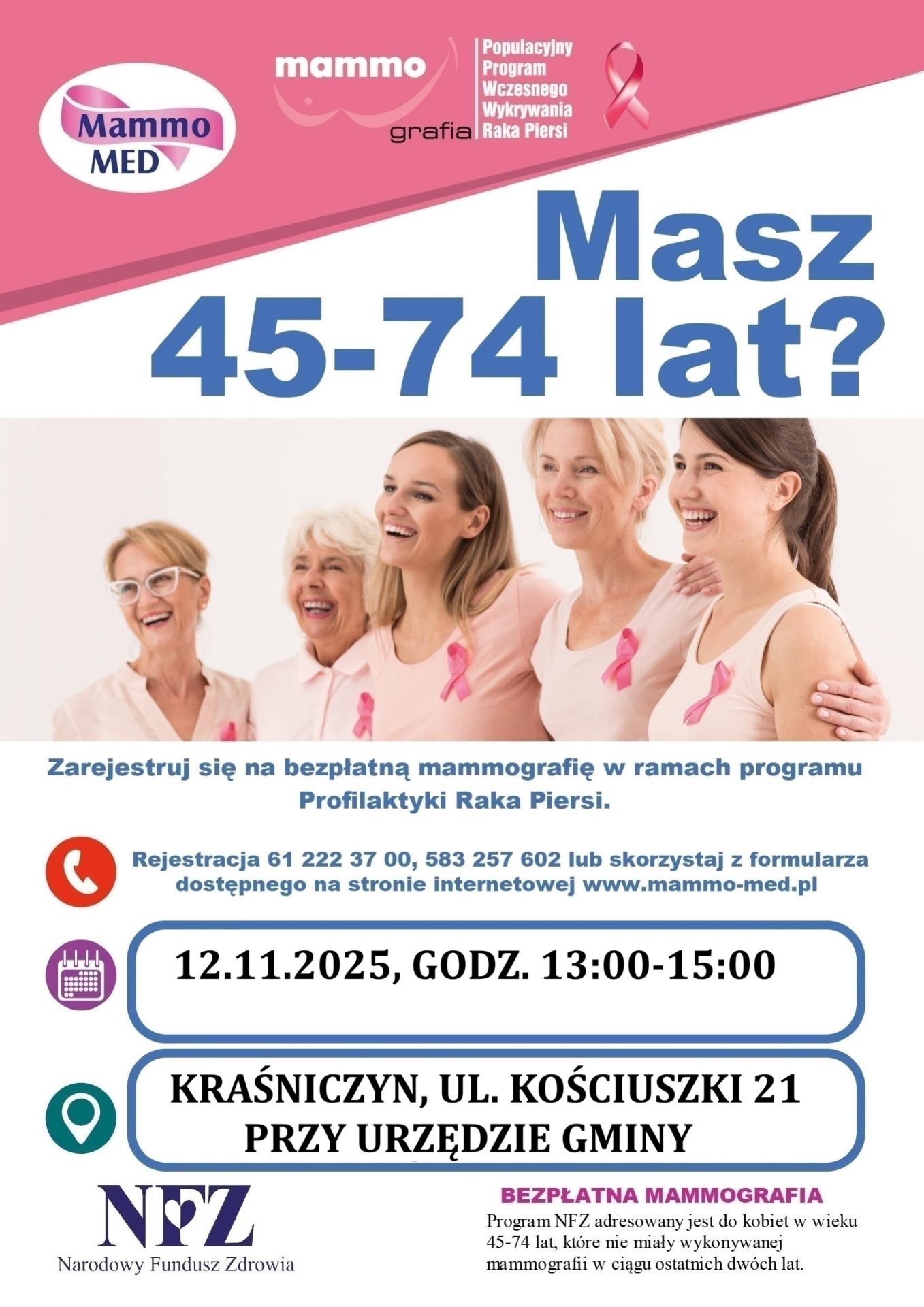 W dniu 12.11.2025 (środa) do Kraśniczyna przyjedzie mammobus, w którym panie w wieku 45-74 lat będą mogły wykonać bezpłatne badanie mammograficzne w ramach programu profilaktyki raka piersi.