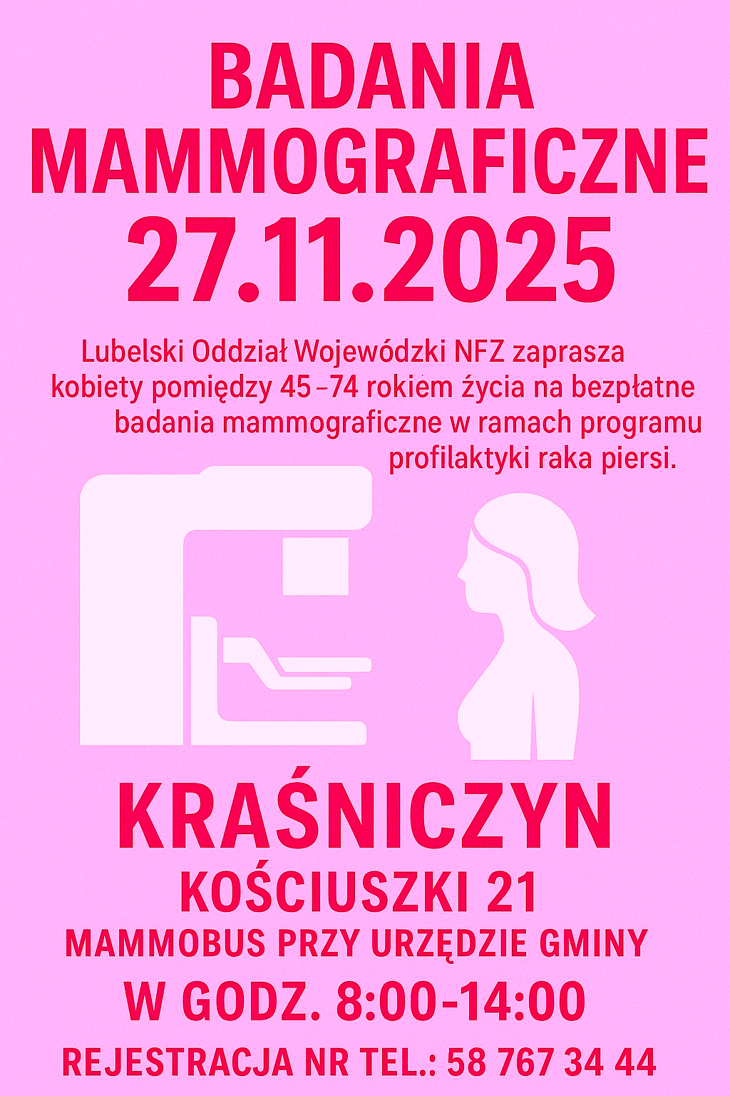 Lubelski Oddział Wojewódzki NFZ zaprasza kobiety w wieku 45–74 lat na bezpłatne badania mammograficzne w ramach Programu Profilaktyki Raka Piersi.