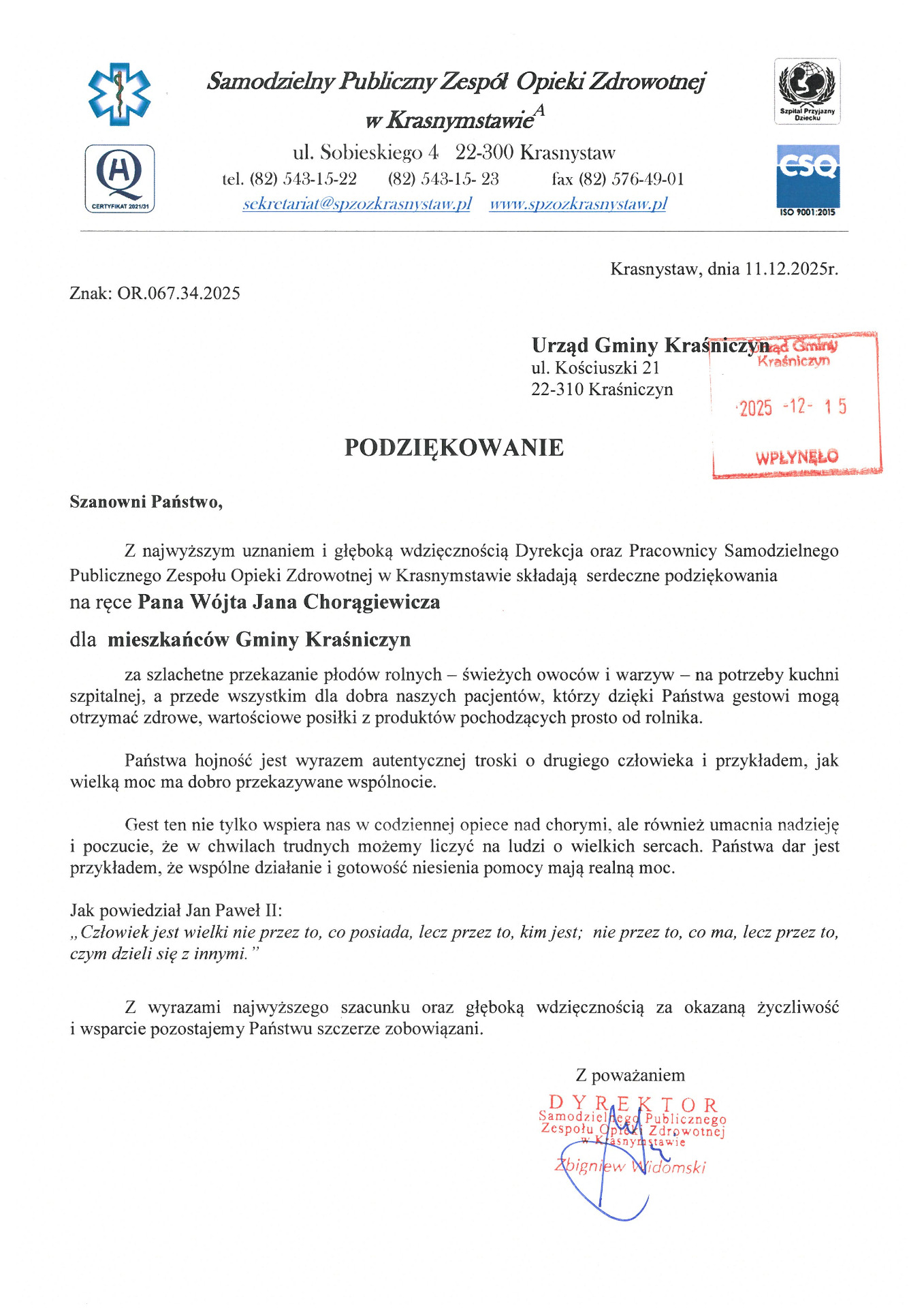 w imieniu własnym oraz Samodzielnego Publicznego Zespołu Opieki Zdrowotnej w Krasnymstawie pragnę złożyć Państwu serdeczne podziękowania za zaangażowanie i okazane serce podczas zbiórki warzyw na potrzeby kuchni szpitalnej.