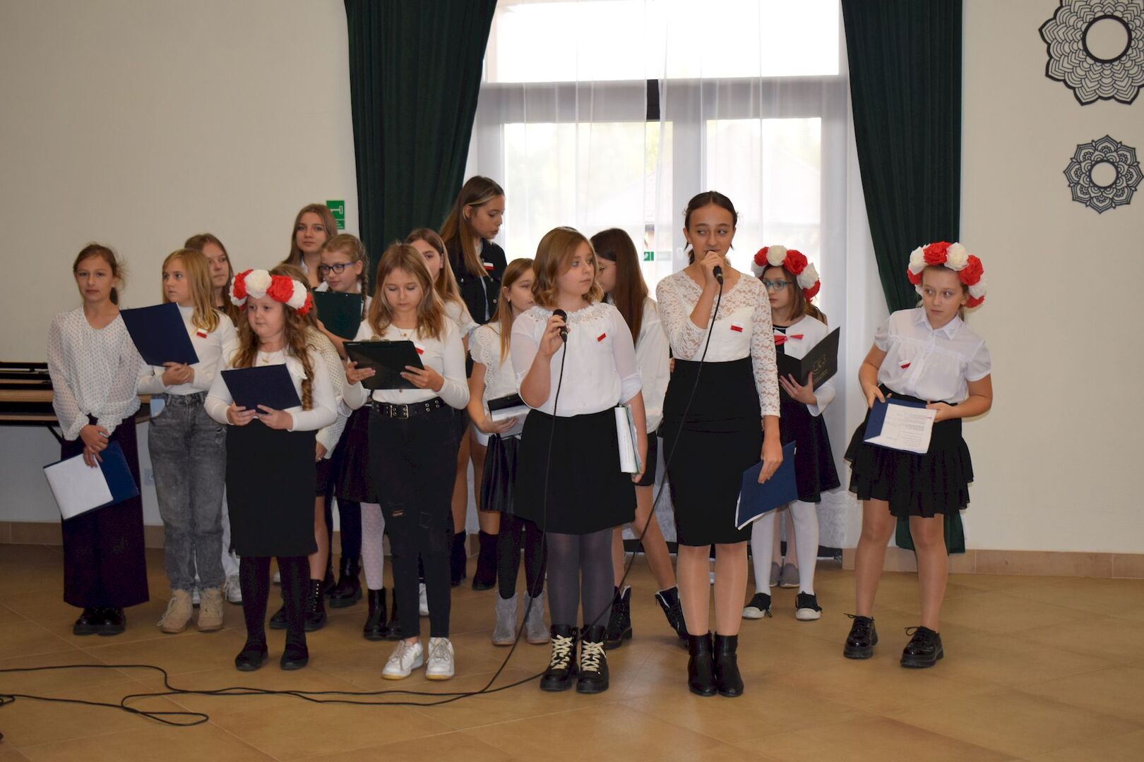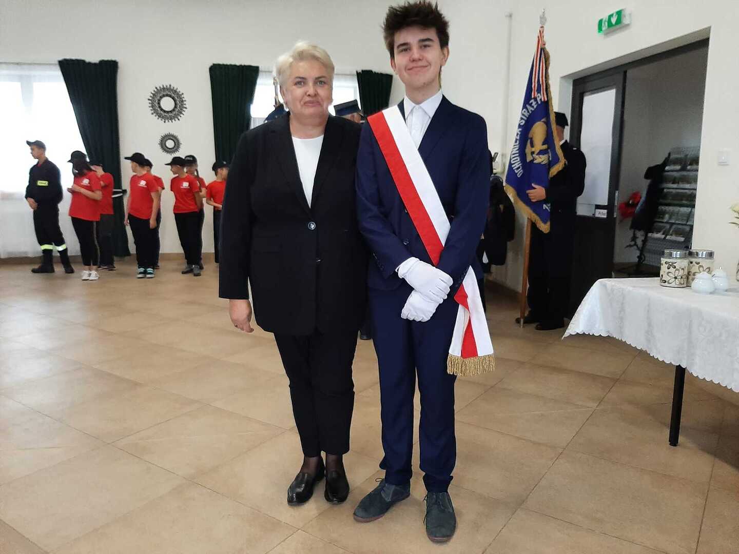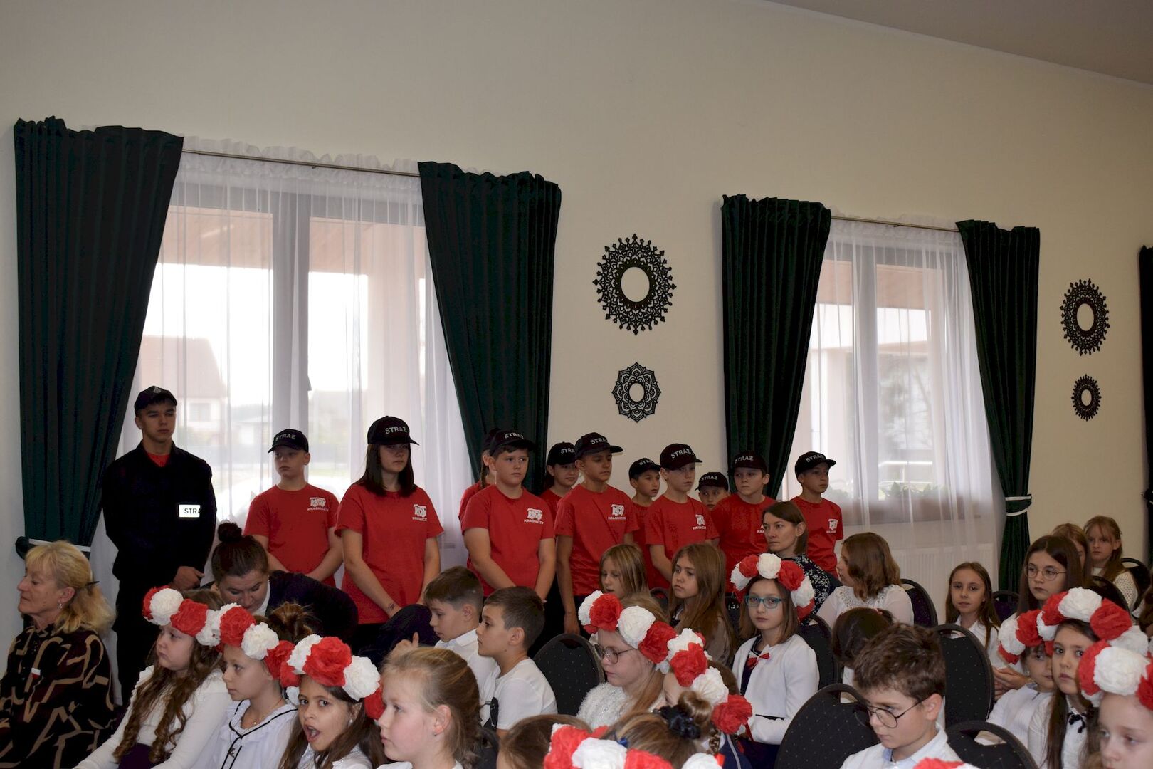 Z okazji tego święta Pani Wójt Monika Grzesiuk ufundowała i przekazała młodzieży 100 biało-czerwonych flag państwowych, aby młode pokolenie uczyć szacunku do Ojczyzny.
