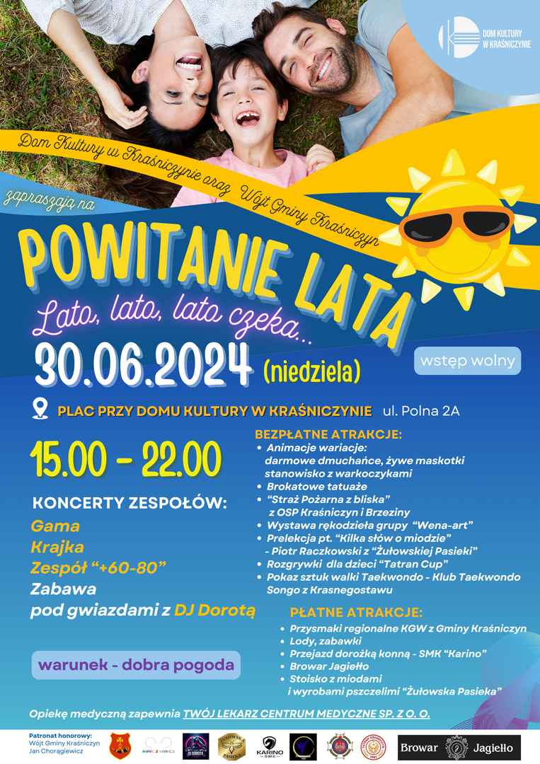 Dom Kultury w Kraśniczynie oraz Wójt Gminy w Kraśniczynie zapraszają na piknik rodzinny – Powitanie Lata „Lato, lato, lato czeka…”! Początek imprezy w niedzielę 30 czerwca, o godzinie 15.00.